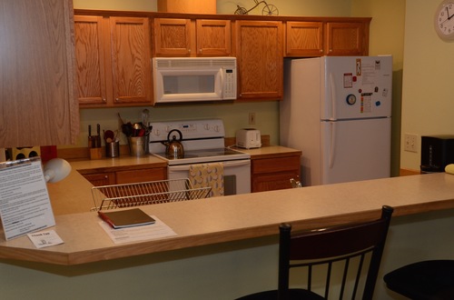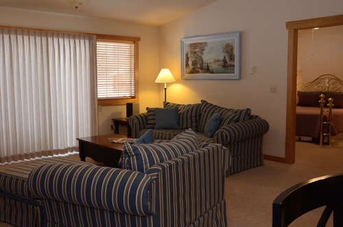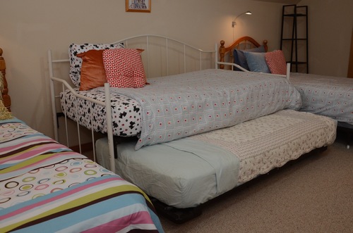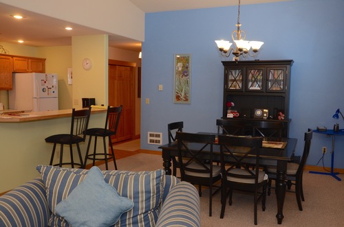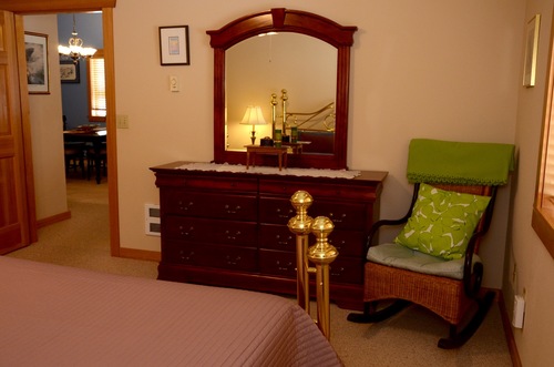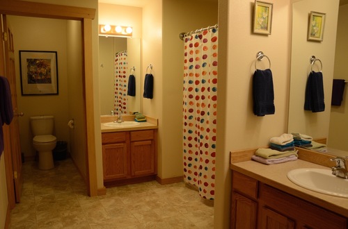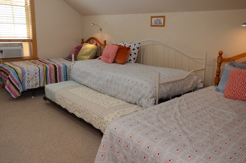 Aurora Borealis Condo has a 3 bedroom layout, two downstairs and one upstairs with 2 full bathrooms in a spacious rambler style layout. Enjoy a king bed and large en-suite bathroom in the master bedroom, a queen bed in the second bedroom, and 3 twin beds as well as a comfortable trundle bed (for two) in the upstairs bedroom (Total sleeping capacity of eight).