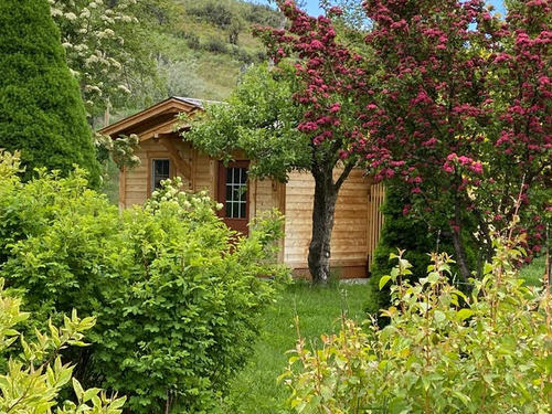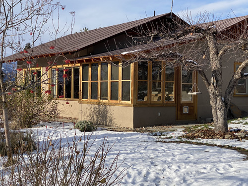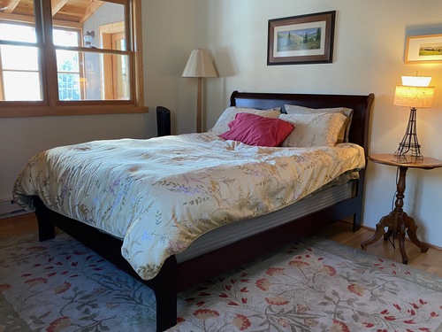 This is a sunny in-town location at the end of the road, with nature surrounding the house. Resident deer amble close by. There is a Queen bedroom, and a Double bedroom, as well as a light filled inside porch. One bathroom with a tub/shower with glass blocks on one end. The living/dining/kitchen is open and comfortable. You can walk to everything Winthrop.